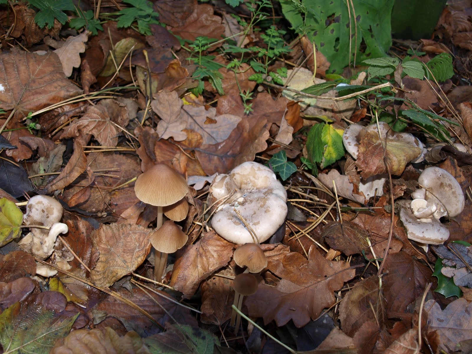 I haven't tried to identify the white fungi but, looking at a fungi id guide, I think the very pretty toadstools in the third photo below may be Clustered Bonnet (Mycena inclinata). Please correct me if I'm wrong.