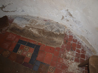 The tower floor contains tiles and a child's stone coffin lid which is 3 feet long and has a simple cross and shaft.